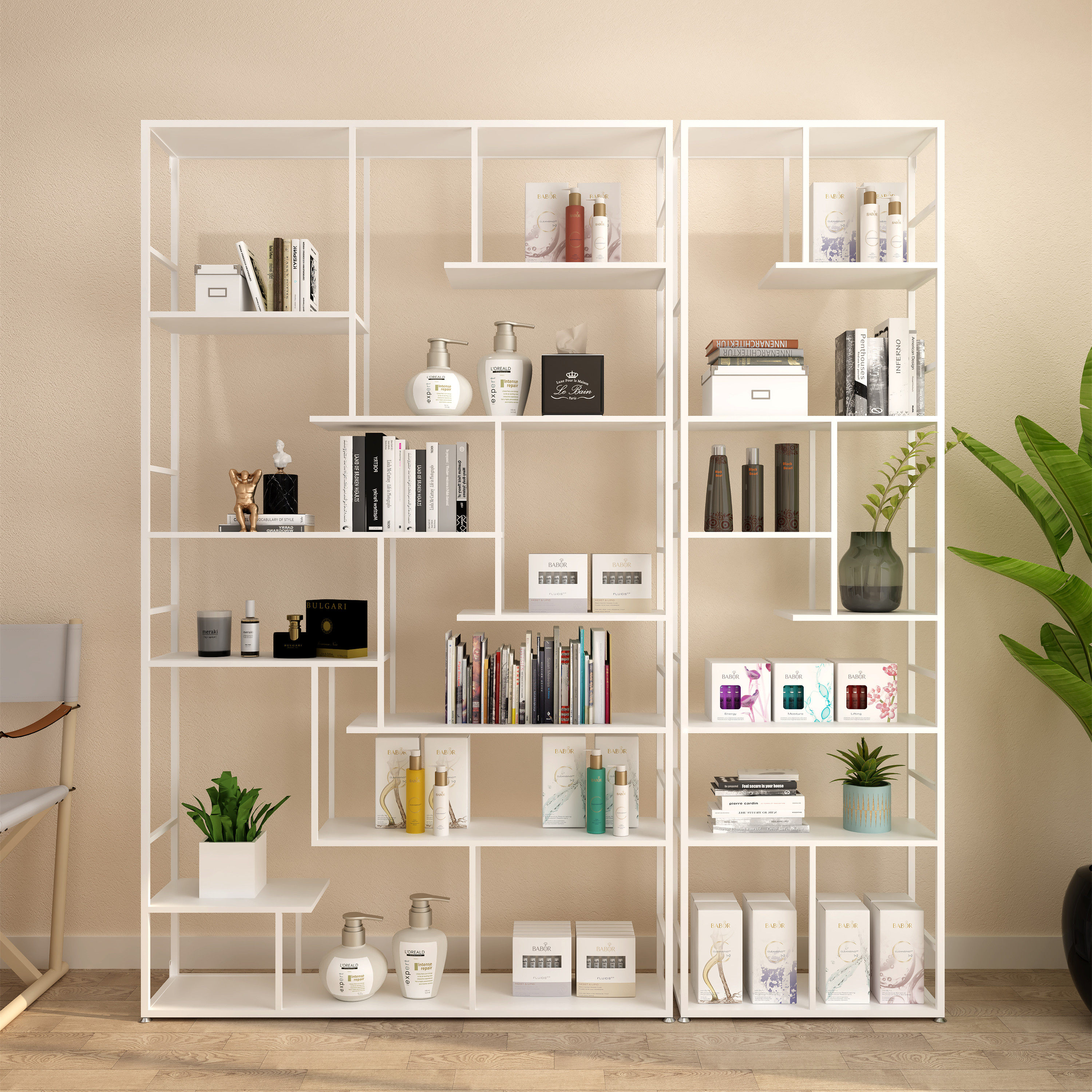 美容院产品展示柜婚纱架影楼收纳工作室靠墙置物化彩妆饰品白色架热门设计联盟服务商